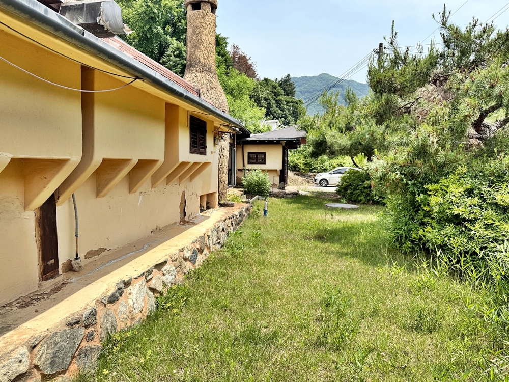 마당은 참 예쁩니다. 잔디가 깔린 자리와 자갈이 놓인 자리가 자연스럽게 어우러지고, 낮은 담장 너머로 심어진 수목들이 바람을 막아주며 공간을 감싸 안습니다. 한쪽에는 야외 수도가 있고, 작지만 든든한 창고도 자리 잡고 있습니다. 여름 저녁에는 이곳에서 고기를 굽고, 아이들은 풀밭을 뛰어다니며 놀았을 듯합니다.