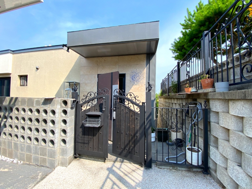이 집은 필지의 단차를 살린 설계로, 위쪽에서는 2층으로 바로 진입할 수 있는 작은 대문과 현관이 있고, 아래쪽에는 잔디 마당과 큰 대문, 주차장이 있습니다.